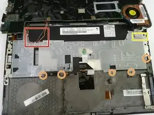 Затем снимите 5 винтов, удерживающих лоток клавиатуры на рамке. Они отмечены оранжевым.