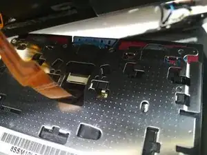 Также поднимите разъём в верхнем левом углу клавиатуры, отмеченный оранжевым. Отсоедините его, поддев ногтями или маленькой отвёрткой.