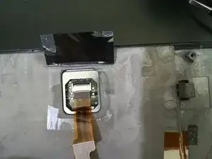 На новом тачпаде снова нужно уложить чёрную ленту в том же порядке, как она была при съёме. Сначала верхняя часть, которую нужно подогнуть под разъём, затем большая чёрная полоса поверх.