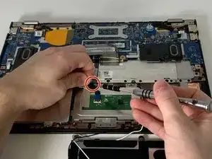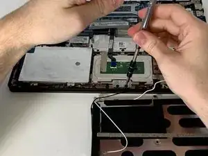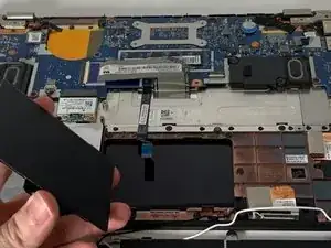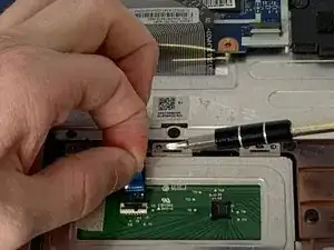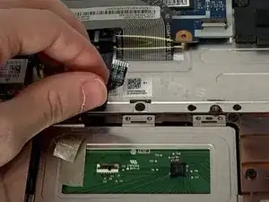Небольшая чёрная защёлка удерживает кабель тачпада. Поднимите эту защёлку вверх с помощью нейлоновой лопатки, чтобы разблокировать разъём.