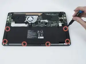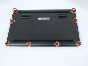 Используйте отвертку Torx T5, чтобы отвинтить восемь винтов 3 мм на нижней крышке ноутбука.