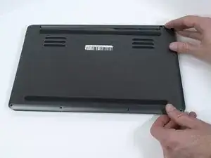 Снимите нижнюю крышку ноутбука, сдвинув её от петли.
