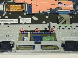 С помощью отвёртки Phillips #00 открутите три винта длиной 2 мм, удерживающих тачпад на месте.