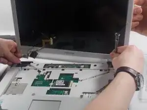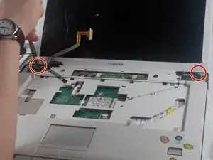 Используя крестовую отвертку #J1, удалите четыре винта длиной 7,6 мм, которые крепят дисплей к корпусу ноутбука.