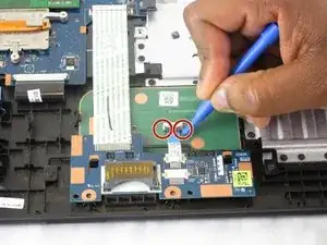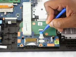 Освободите две защёлки, соединяющие синюю шлейф-ленту с внешним тачпадом.
