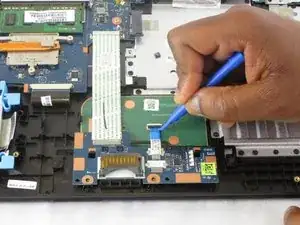 Освободите защёлки, удерживающие белую шлейф-ленту между модулем тачпада и материнской платой.