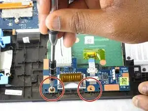 Отвинтите два винта 7 мм, крепящие модуль тачпада к задней панели, используя насадку PH1 и магнитный держатель отвертки.
