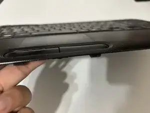 Используйте лопатку, чтобы освободить защёлки по периметру сборки клавиатуры, которые крепят её к нижней части корпуса. Поднимайте сборку медленно, чтобы обнажить ZIF-разъём, соединяющий её с материнской платой.