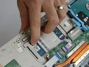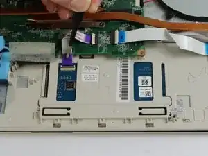 С помощью лопатки приподнимите чёрную защёлку, удерживающую ленточный кабель тачпада.