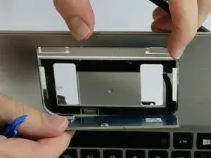 Пока тачпад удерживается, используйте лопатку, чтобы соскрести клей, приклеивающий тачпад к основанию.