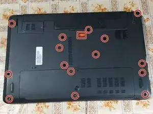 Удалите все указанные болты, выньте батарею и DVD-привод. Болты, отмеченные красным, имеют размер M3.0x8.0.