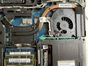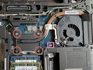 Осторожно отключите разъём вентилятора (розовый прямоугольник).