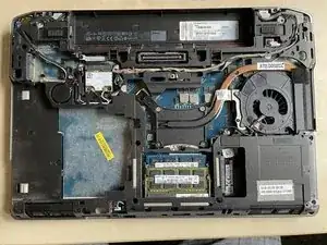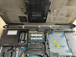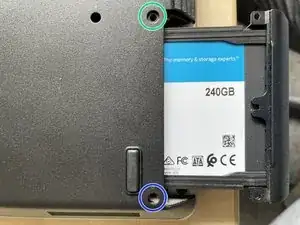Жёсткий диск или SSD имеет общий винт с задней крышкой. Также открутите винт, указанный на изображении (синий круг)