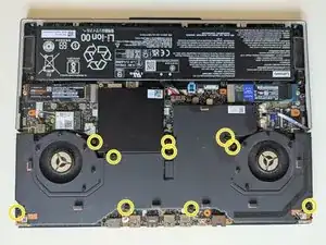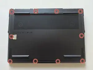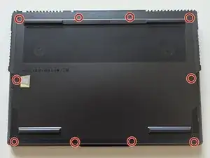 Используя отвёртку с крестообразным наконечником, открутите десять винтов, крепящих заднюю крышку ноутбука.
