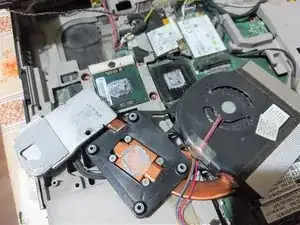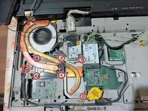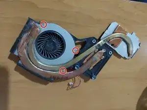Открутите винты, удерживающие радиатор процессора и вентилятор. Отключите кабель вентилятора.