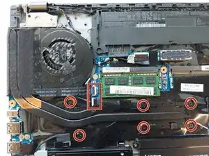 Открутите 6 винтов, удерживающих кулер процессора. Отключите кабель вентилятора, освободив защёлку разъёма и вынув кабель.