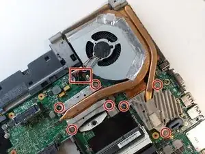 Открутите 7 винтов, удерживающих радиатор процессора, и отключите вентилятор.