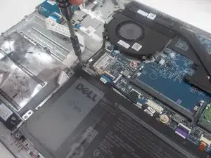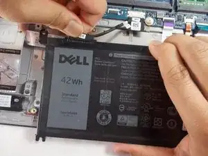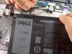 Отсоедините кабельный разъем материнской платы от верхнего левого угла аккумулятора.