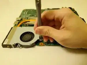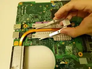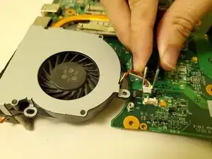 Пинцетом аккуратно отсоедините кабель вентилятора CPU, затем снимите вентилятор с радиатора.