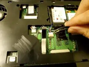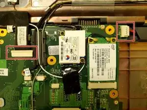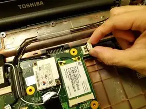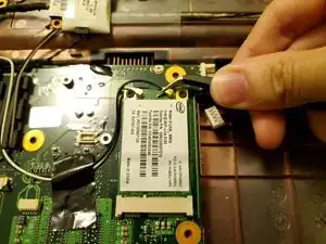 Пинцетом аккуратно поднимите и отсоедините антенные провода беспроводной карты от коаксиальных разъёмов.
