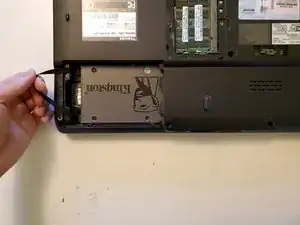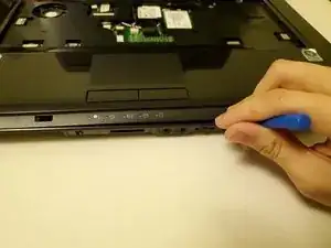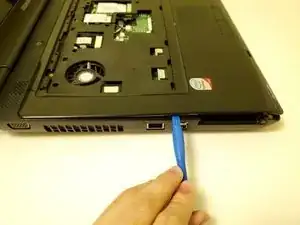 Начните снимать верхнюю крышку, аккуратно поддевая правую сторону инструментом для вскрытия. Начните с поиска зазора рядом с пустым отсеком для DVD-привода.