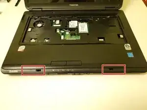 Положите устройство клавиатурой вверх, затем используйте инструмент для вскрытия, чтобы аккуратно снять верхнюю рамку клавиатуры.