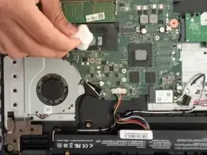 Возьмите новый ватный тампон, смочите его изопропиловым спиртом и аккуратно протрите термопасту с графического и центрального процессоров.