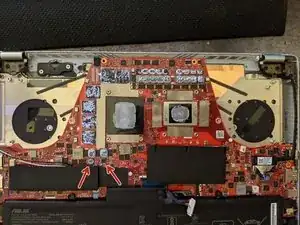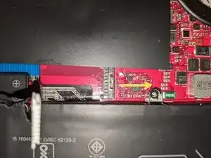 Аккуратно отсоедините кабель дисплея, закрытый пластиком, на самой левой стороне платы — помечен синим.