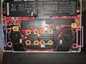 Красным и оранжевым цветом помечены винты, удерживающие систему охлаждения. Они все одного размера, но я все равно советую запомнить, где был установлен вентилятор, а где основной блок.