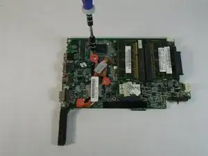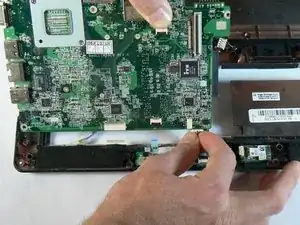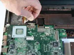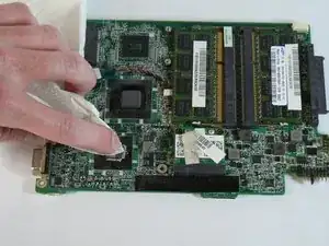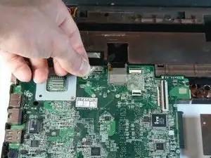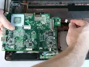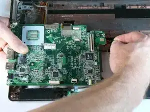 Клемма батареи в верхнем правом углу материнской платы, вероятно, застрянет в отверстии, ведущем к отсеку батареи. Возможно, потребуется лёгкое покачивание, чтобы освободить её.