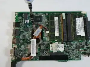 Отверните четыре оставшихся винта, удерживающих материнскую плату, используя бит PH1. Серебристые винты имеют длину 5,6 мм, чёрные — 3,6 мм.