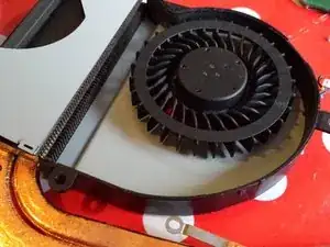 Используйте отвертку с плоским шлицем, чтобы отщелкнуть серую часть вентилятора.