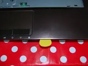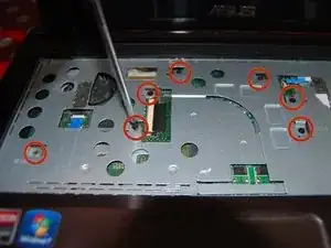 Шлейф клавиатуры находится прямо под клавиатурой. Аккуратно снимите клавиатуру, поднимая её верхнюю часть.