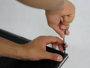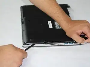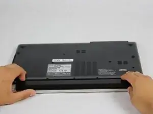 Найдите все винты на задней панели ноутбука, как показано на изображении. Два винта удерживают батарею на месте.