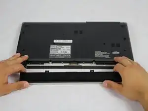 Установите заднюю панель на ноутбук и нажмите по краям, чтобы защёлкнуть панель на месте.
