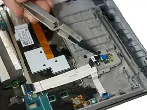 С помощью лопатки отстегните шлейф, идущий от верхней средней части аккумулятора к материнской плате, от платы.