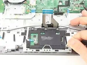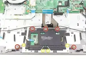 Удалите еще четыре серебристых винта длиной 2.9 мм от серебристого крепления на трекпаде с помощью отвертки.