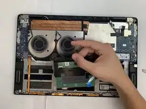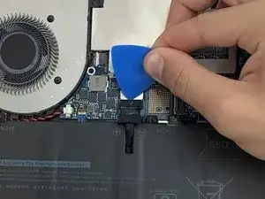 Аккуратно подденьте пластиковым медиатором между вентилятором и межсоединительным кабелем.