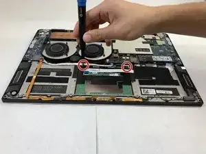 Используйте крестообразную отвертку Phillips #0, чтобы вывернуть два серебряных винта 3,2 мм, расположенных в двух верхних углах трекпада.