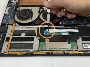 Немного откройте ноутбук и поместите руку под трекпад, аккуратно подденьте трекпад и приподнимите его из корпуса.