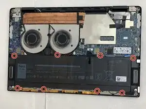 Используйте крестообразную отвертку Phillips #0, чтобы вывернуть восемь винтов 6,4 мм, крепящих аккумулятор.