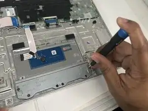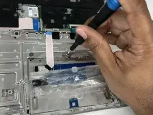 Используйте крестовую отвертку, чтобы вынуть шесть винтов длиной 2,9 мм, фиксирующих металлическую планку, поддерживающую трекпад.