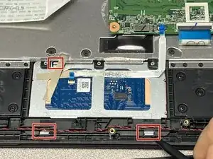 Трекпад удерживается на 3 защёлках (2 внизу и 1 вверху слева); с помощью лопатки отожмите защёлки и извлеките трекпад из корпуса.