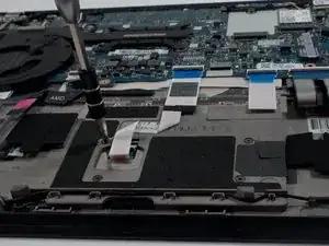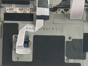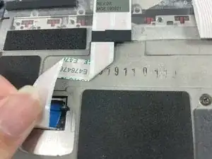 Используйте инструмент открытия iFixit, чтобы поднять небольшой замковый флажок на одном соединении ZIF кабеля трекпада. Кабель должен легко выйти из гнезда.