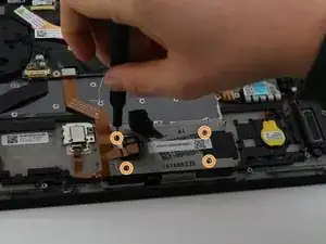 Удалите четыре винта длиной 2 мм, фиксирующие трекпад, с помощью крестовой отвертки Phillips #000.