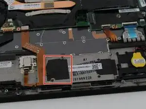 Оттяните чёрную клейкую ленту, прикрывающую ленточный кабель, соединяющий трекпад и сканер отпечатка пальца с материнской платой.
