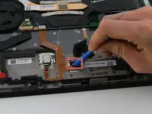 Используйте монтажный инструмент, чтобы поднять защёлку ленточного разъёма и вынуть ленточный кабель, после чего трекпад можно будет извлечь.
