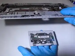 При подъёме нижней панели трекпад должен вывалиться из устройства.