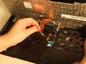Удерживая за язычок шлейфа, потяните, чтобы отсоединить клавиатуру.