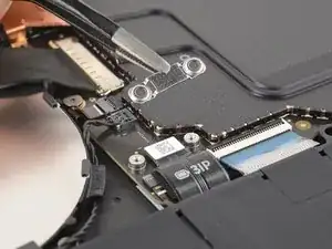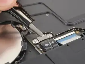 Пинцетом захватите пластиковую тягу кабеля трекпада и аккуратно вытащите кабель из гнезда.